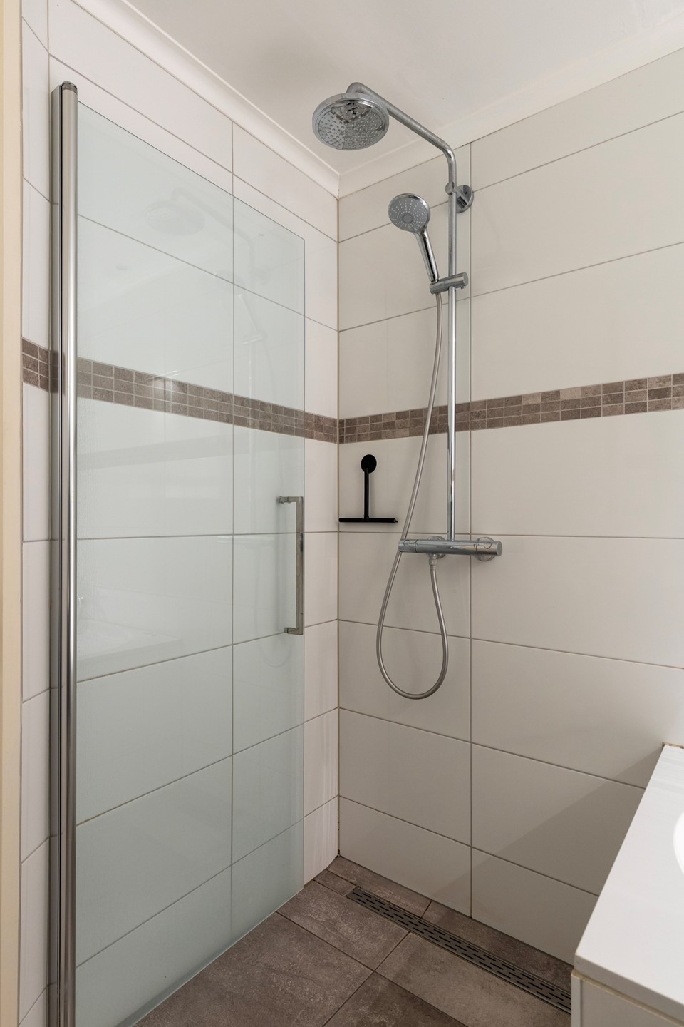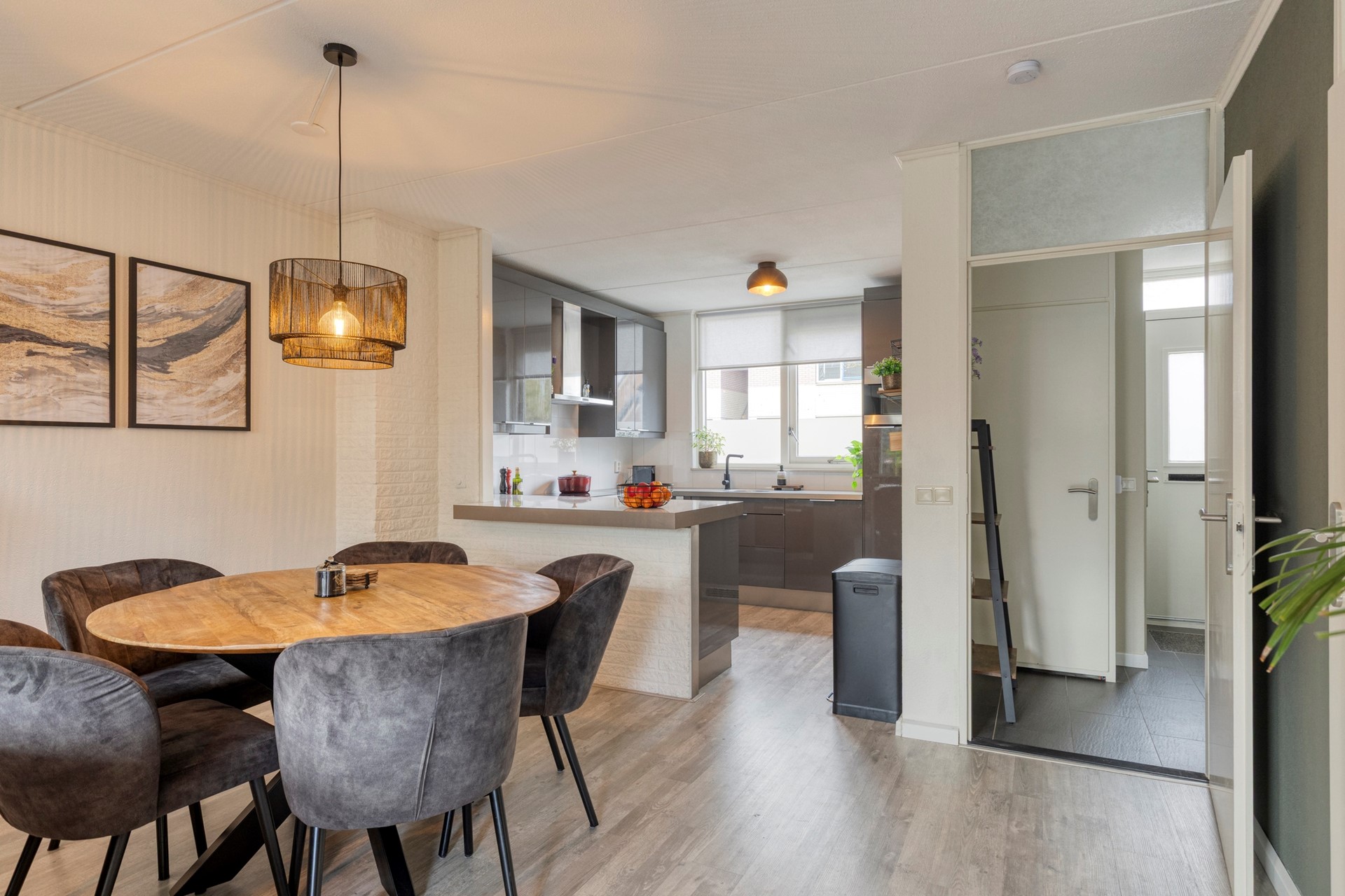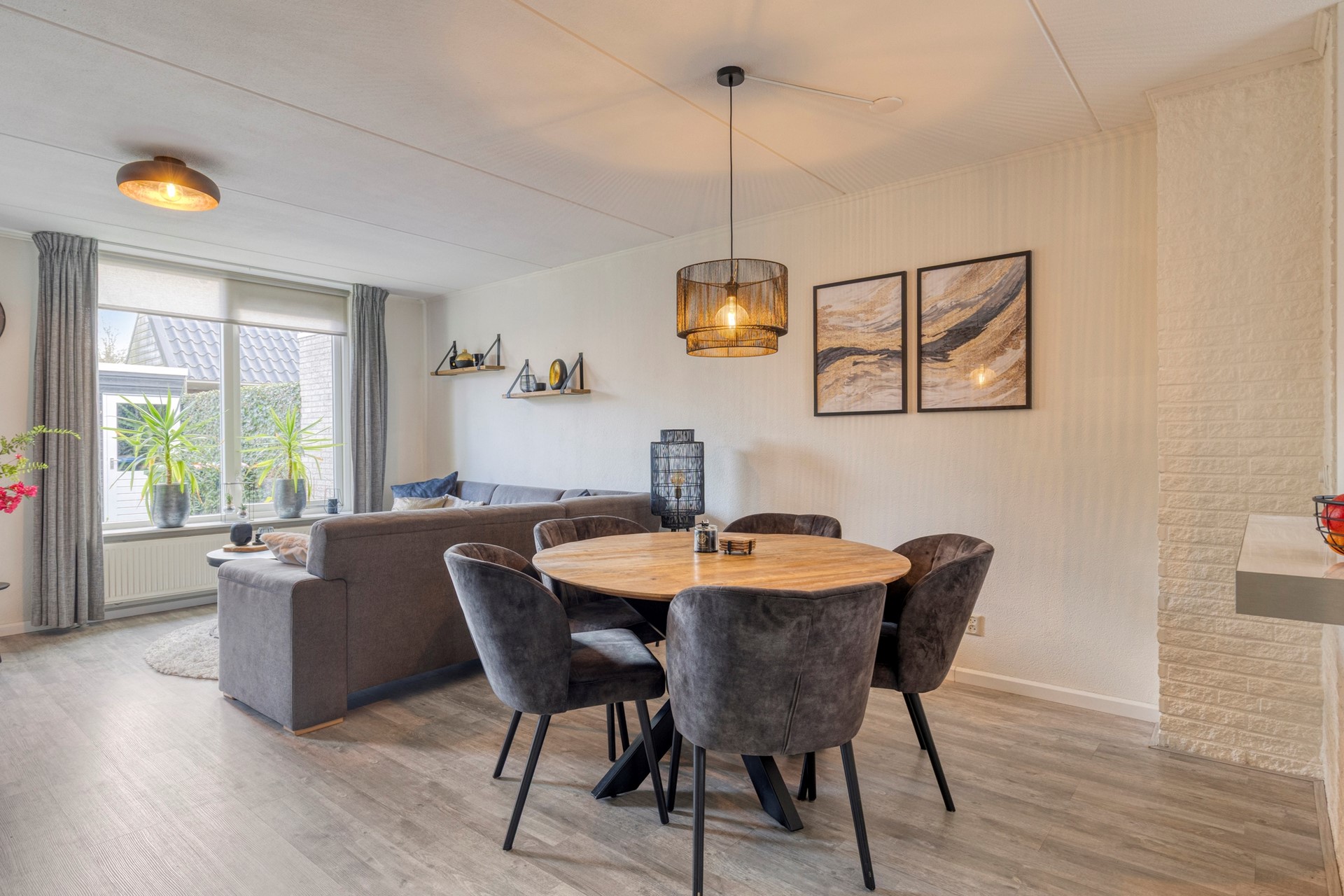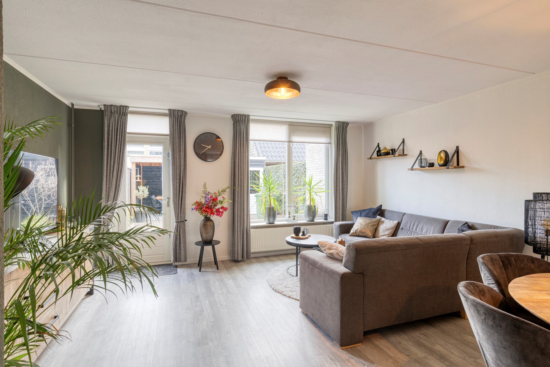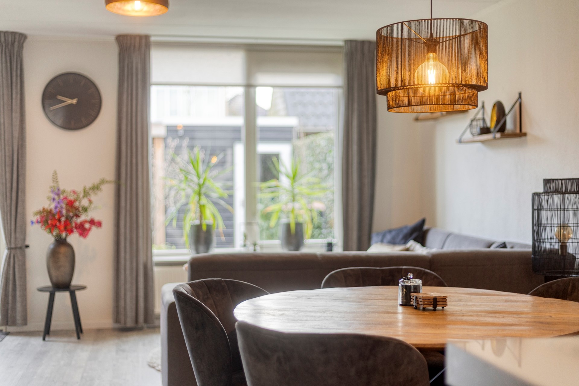 De woonkamer ligt aan de achterzijde van de woning en profiteert van een prettige lichtinval dankzij de grote raampartijen en een mooi uitzicht op de tuin. De ruimte voelt open en comfortabel aan en biedt volop plek voor een gezellige zithoek en een ruime eettafel. Daarnaast beschikt de woonkamer over een praktische provisiekast voor extra bergruimte.