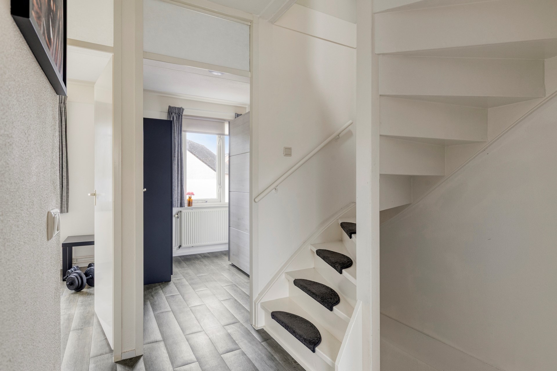 Je komt binnen in een nette hal met meterkast, trapopgang en een zwevend toilet met fontein.