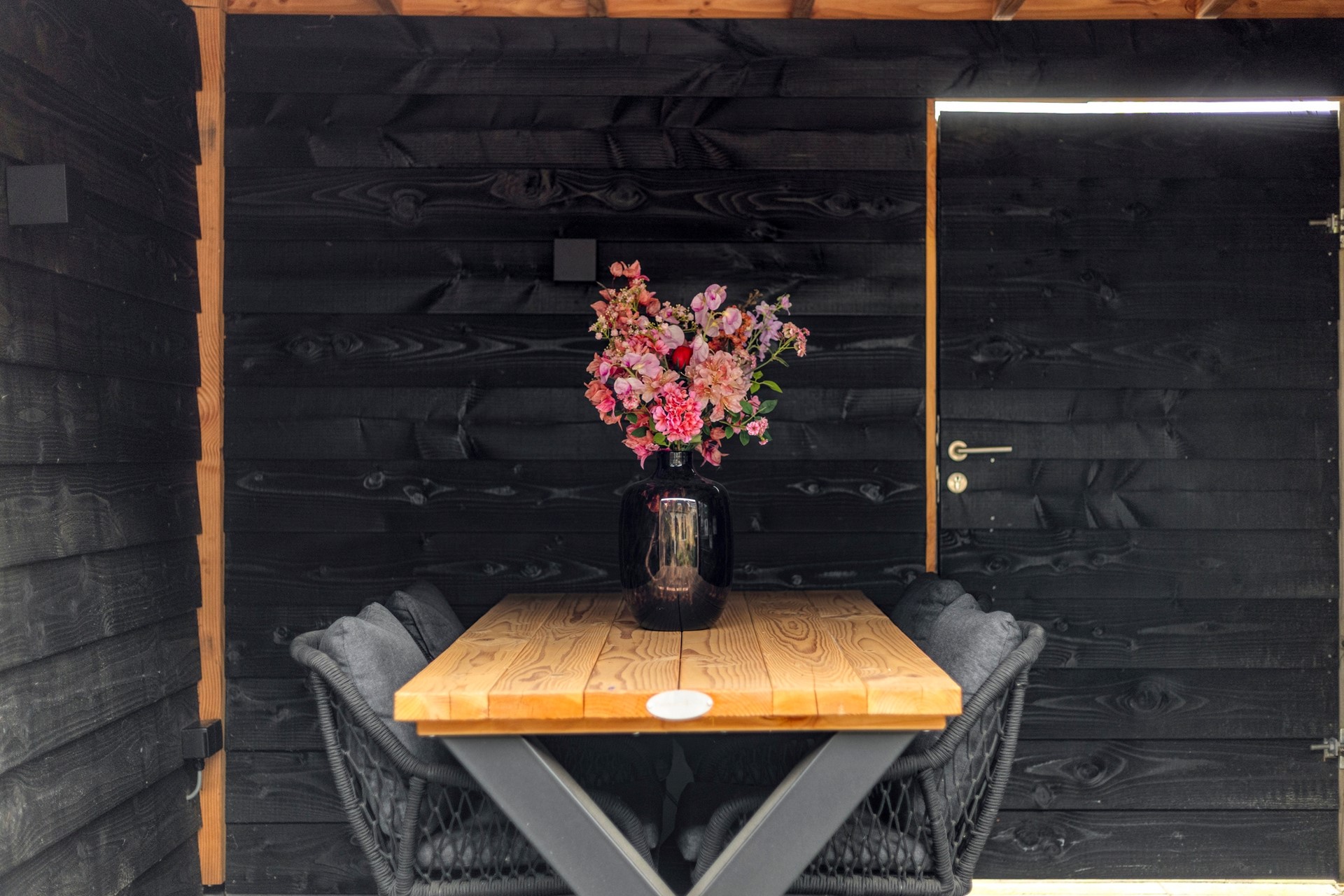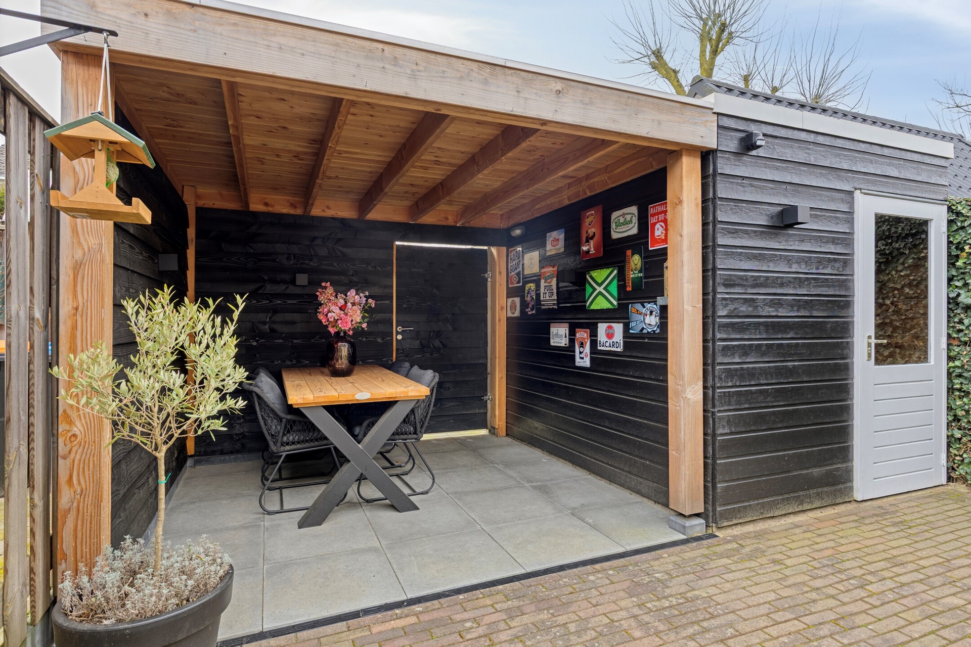 Achter in de tuin staat een vrijstaande houten berging, ideaal voor het stallen van fietsen en het opbergen van tuingereedschap. Aan de berging is een sfeervolle overkapping aangebouwd, waardoor er een heerlijke beschutte zitplek is ontstaan. Hierdoor kun je al vroeg in het voorjaar en tot laat in het najaar comfortabel buiten zitten.